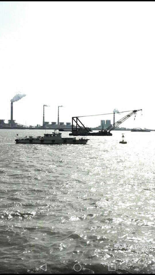 2月6日下午1523时,天气晴朗,微风徐徐。苏通大桥上游,在常熟、南通海事局“海巡06830”等三艘海巡艇和“锦通11”等五艘拖轮、警戒艇的维护警戒下,1000KV苏通GIL综合管廊工程上行船舶推荐航路勘察作业施工船“盐捞8”完成四个勘探孔位最后SZ4孔位的勘前定位。